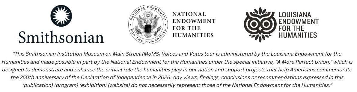 The Smithsonian’s Museum on Main Street, in cooperation with the Louisiana Endowment for the Humanities, presents “Voices and Votes: Democracy in American.” The exhibition examines the nearly 250-year-old American experiment of a government “of, by and for the people,” and how each generation since continues to question how to form “a more perfect union.” Opening at the Old State Capitol “Voices and Votes” will be on view October 29 through December 11.